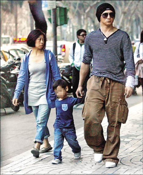 吳奇隆(右)一臉酷樣,緊牽著小男童的手,與短髮熟女(左)走在仁愛路上。(專案組攝)