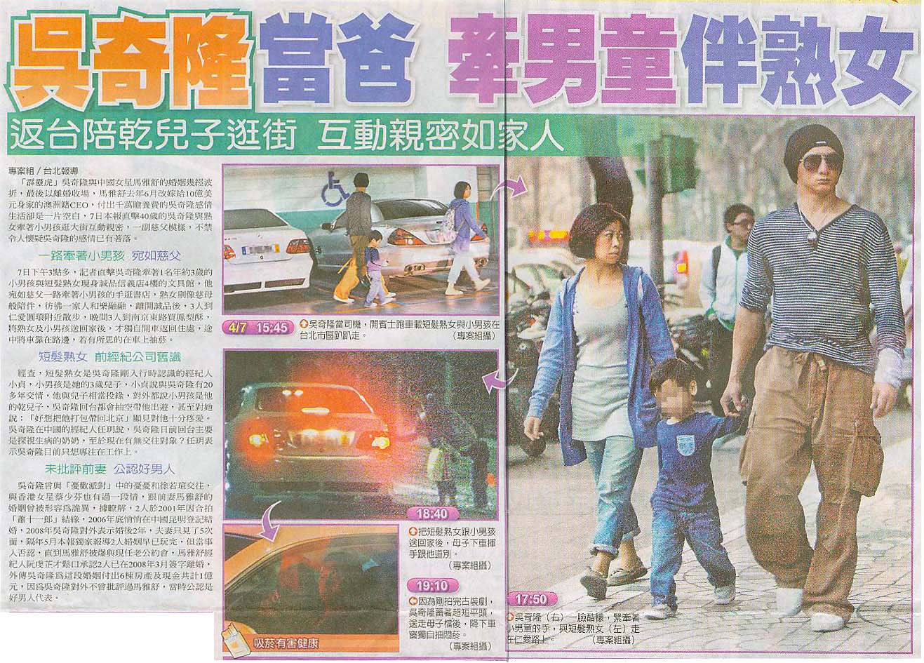 7日下午3點多,記者直擊吳奇隆牽著1名年約3歲的小男孩與短髮熟女現身誠品信義店4樓的文具館,他宛如慈父一路牽著小男孩的手逛書店,熟女則像慈母般陪伴,彷彿一家人和樂融融,離開誠品後,3人到仁愛圓環附近散步,晚間3人到南京東路買鳳梨酥,將熟女及小男孩送回家後,才獨自開車返回住處,途中將車靠在路邊,若有所思的在車上抽菸。