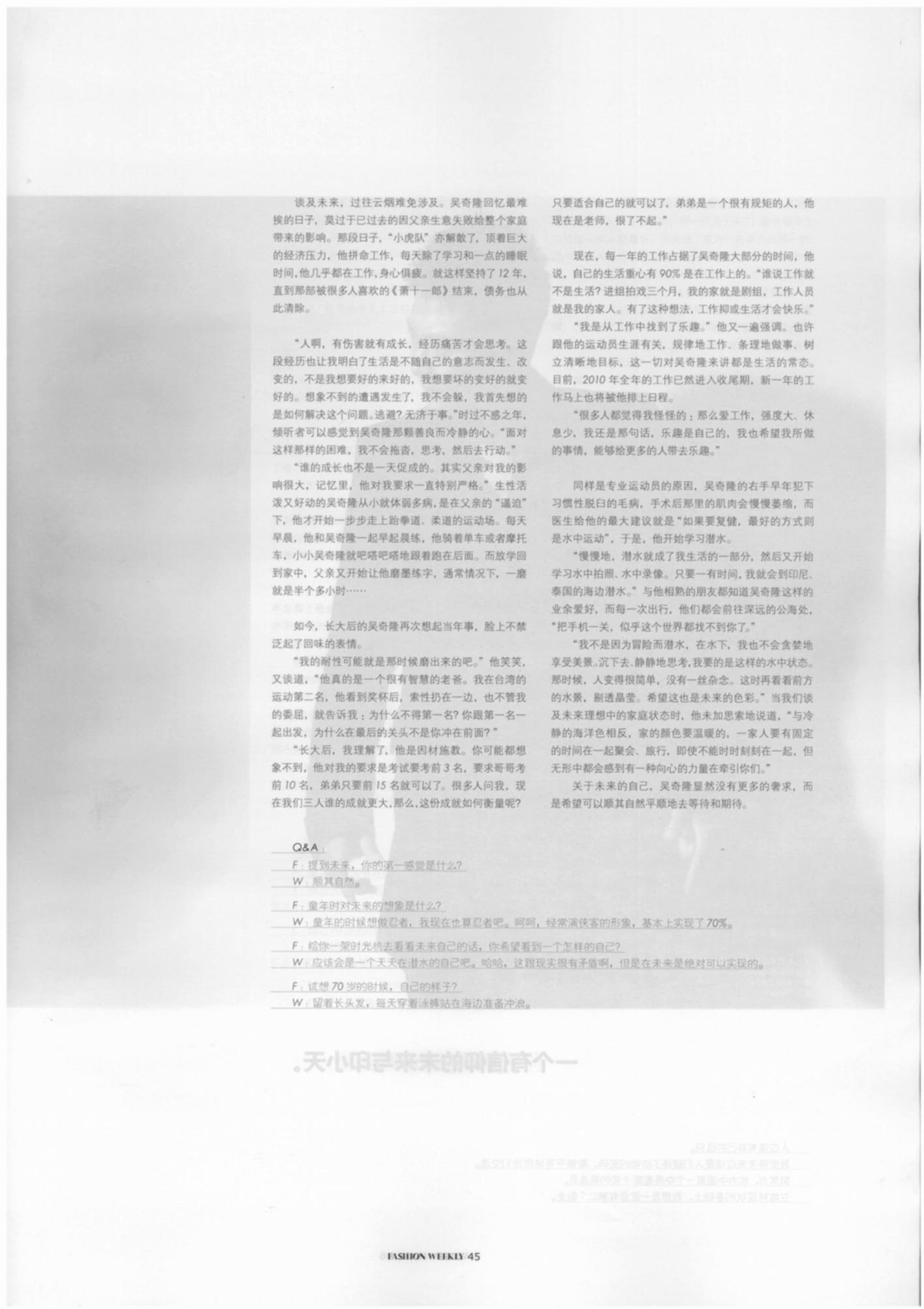 “人啊,有伤害就有成长,经历痛苦才会思考。这段经历也让我明白了生活是不随自己的意志而发生、改变的,不是我想要好的来好的,我想要坏的变好的就变好的。想象不到的遭遇发生了,我不会躲,我首先想的是如何解决这个问题。逃避?无济于事。”时过不惑之年,倾听者可以感觉到吴奇隆那颗善良而冷静的心。“面对这样那样的困难,我不会拖沓,思考,然后去行动。”