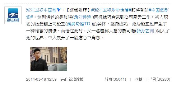 今日浙江卫视中国蓝官方微博发布消息:“【蓝媒推荐】#浙江卫视步步惊情#即将登陆#中国蓝剧场#。该剧讲述的是张晓(@刘诗诗 )因机缘巧合来到公司震天工作。初入职场的她受到上司殷正(@吴奇隆TD )的关怀,逐渐成熟,她与殷正也产生了一种难言的情愫。而恰在此时,又一名善解人意的康司瀚(@孙艺洲 )闯入了她的世界,三人展开了一段虐心三角恋。”消息一经发布就引起步步迷们的热烈关注。新浪电视也致电浙江卫视相关负责人,对方表示确实会在浙江卫视中国蓝剧场播出,时间4月22日,并且此次是全国独播。(Lorring/文)